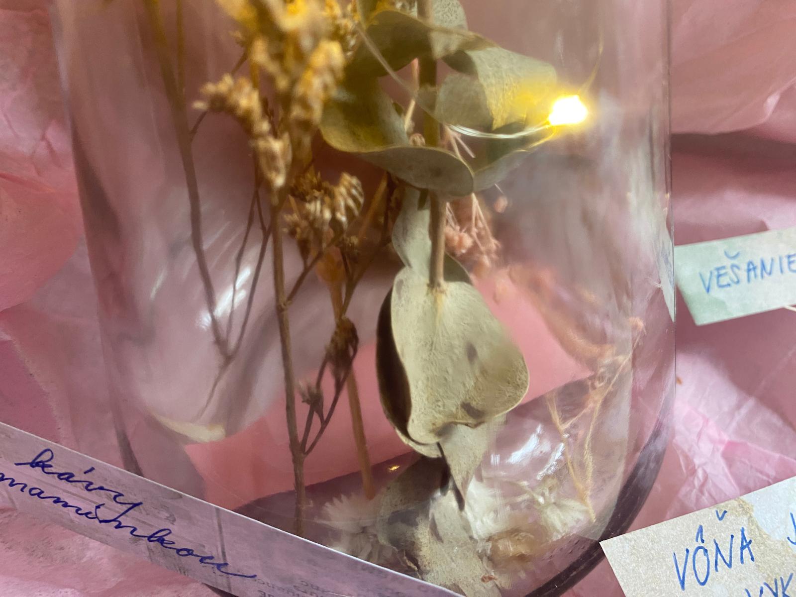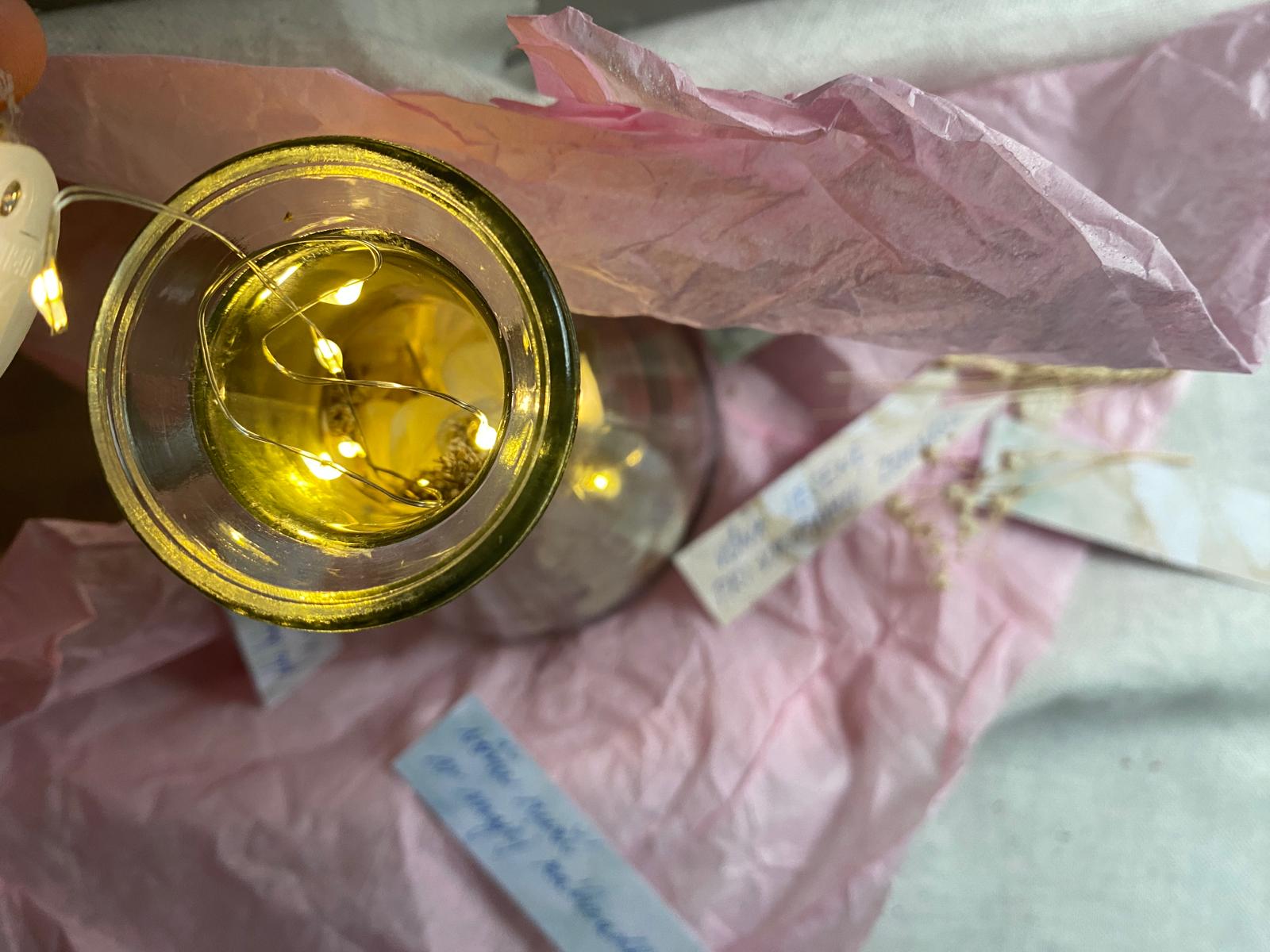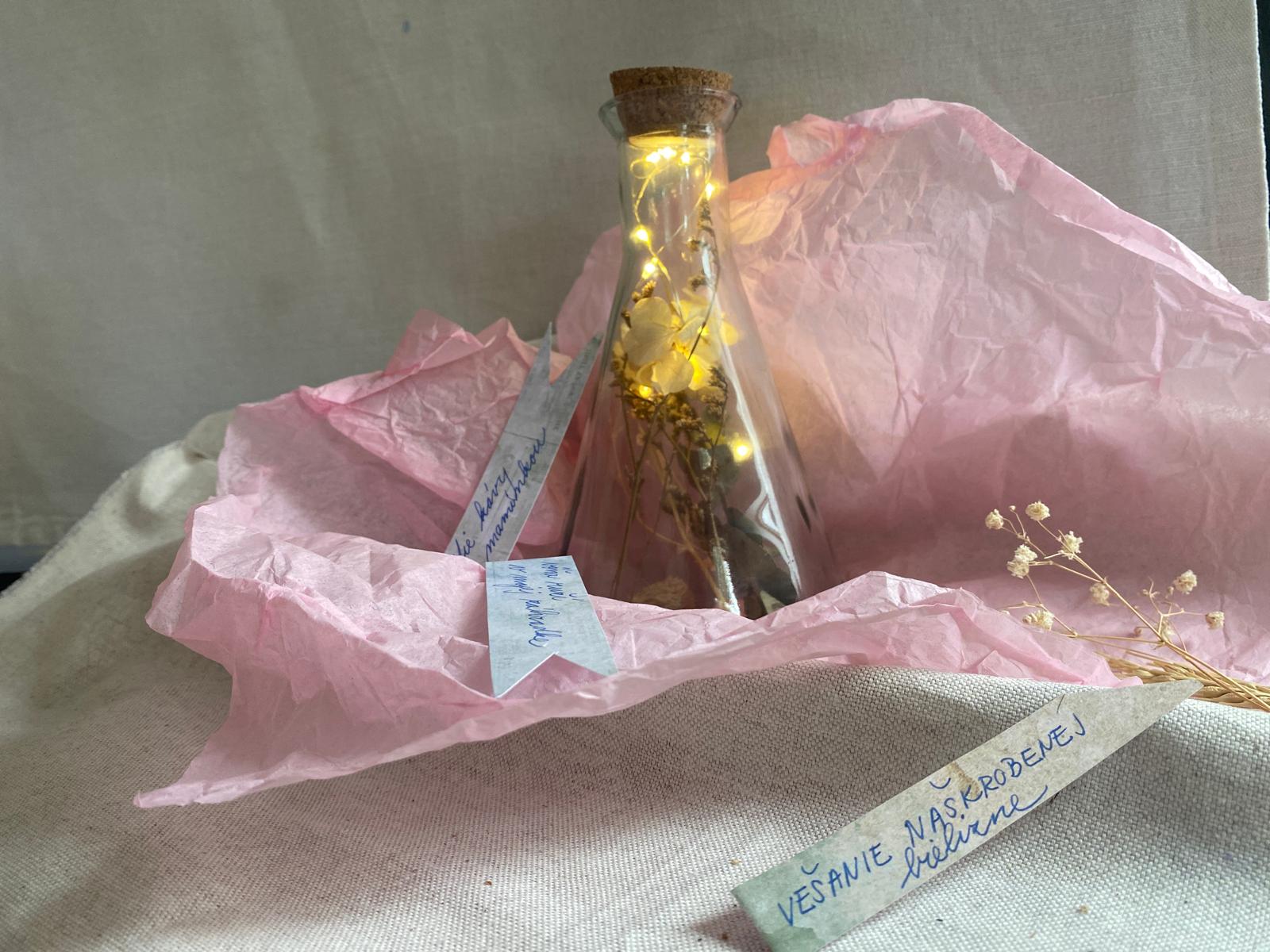 Balenie obsahuje 1 fľaštičku (výška 19 cm a šírka 11,5 cm) s korkovou zátkou so svetelným efektom, vnútro je naplnené ozdobnými bylinkami. Pribalené sú aj lístky, na ktoré sa píšu odkazy.