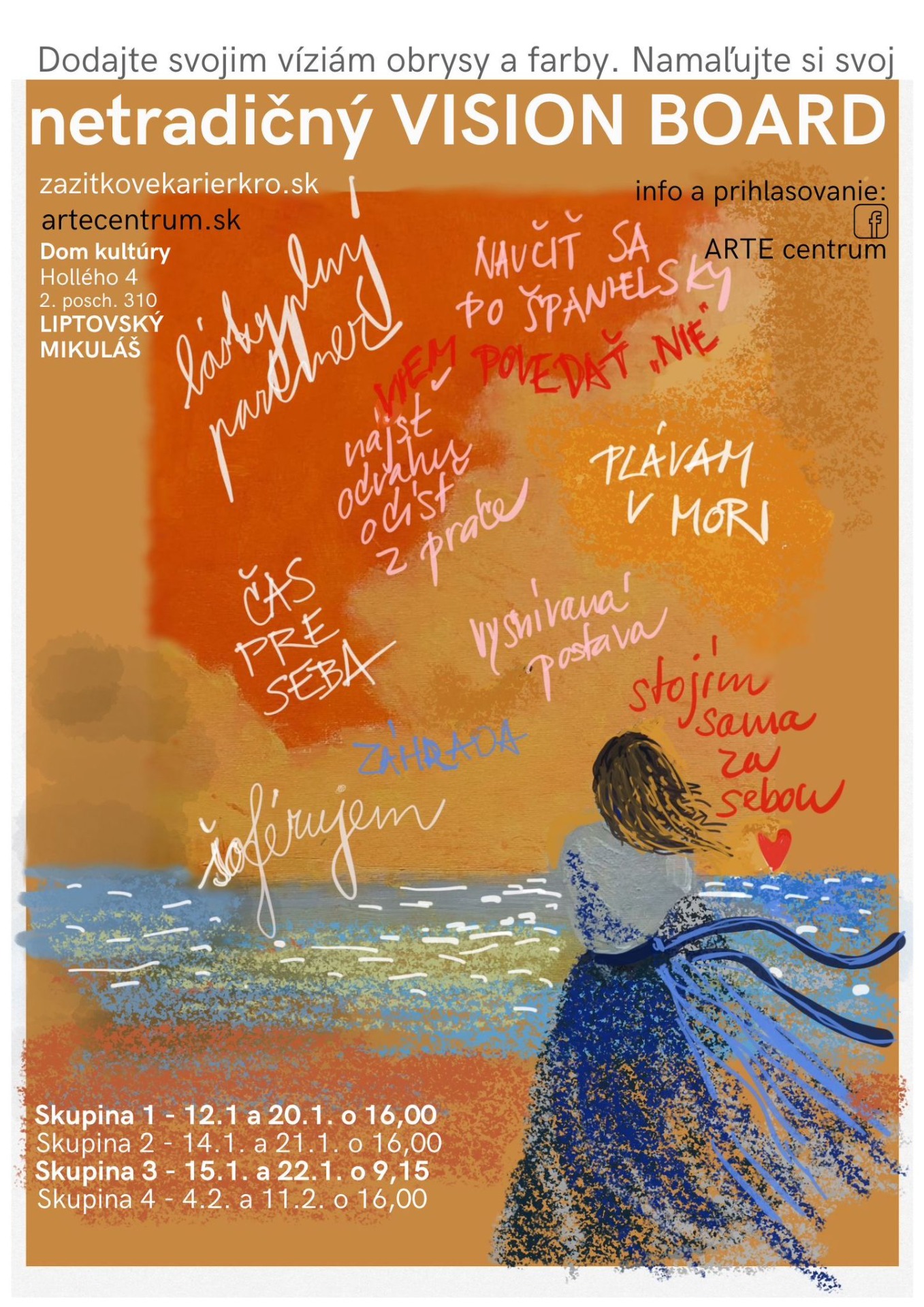 Práve teraz je čas vytvoriť si netradičný VISION BOARD. Všetci dobre poznáte nástenku snov. My si však spravíme inú. Netradičnú. Fungujúcu. Svoju. Spravíme si ju ako OBRAZ, do ktorého zakomponujeme všetky svoje dôležité sny. Bude to obraz maľovaný, aký si s hrdosťou zavesíte v izbe na stene. No zároveň bude obsahovať šifry k tvojim snom a cieľom.